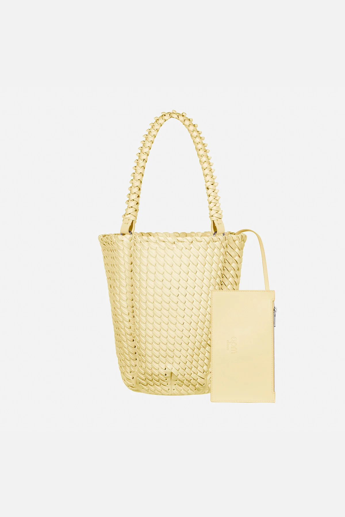 Featuring the knit pattern in a stunning yellow pastel hue, this bucket bag exudes both style and practicality.